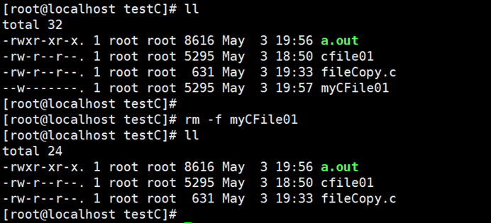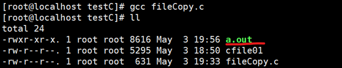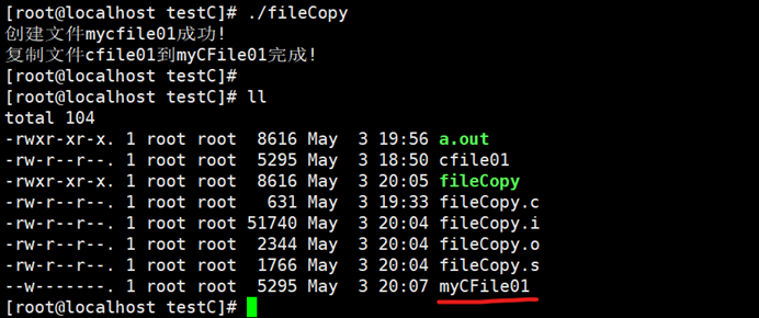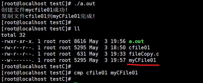 5、运行可执行文件“a.out”,根据结果可知程序运行成功,源文件与目标文件比较结果显示一致,文件复制成功: