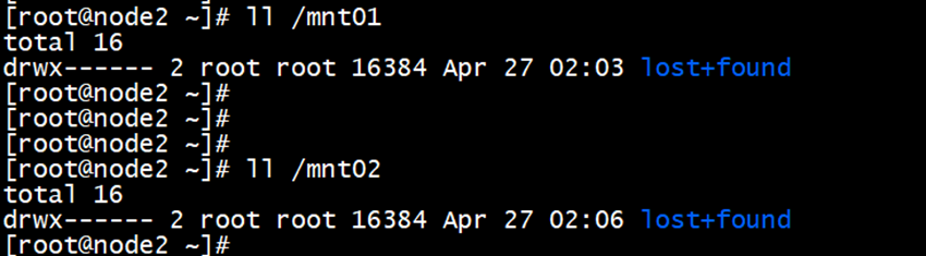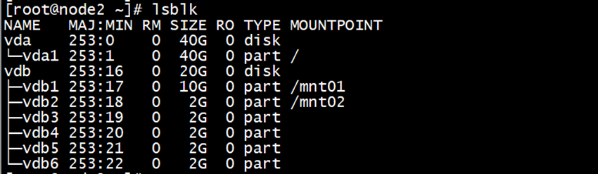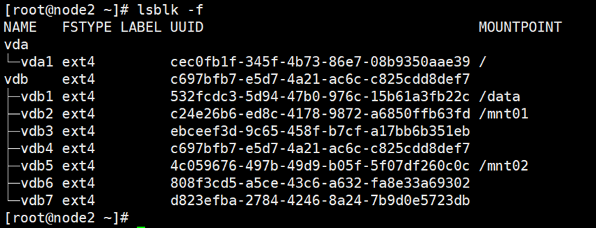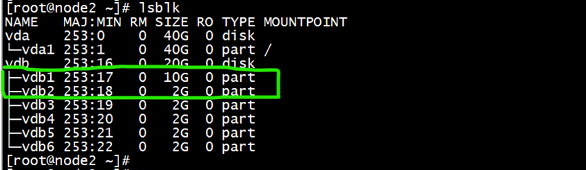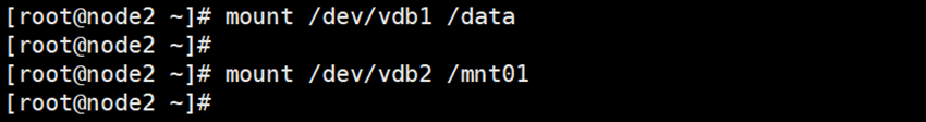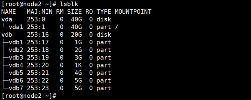 (4)再次查看磁盘挂载情况。 结果显示分区vdb1和vdb2已经没有挂载点了。