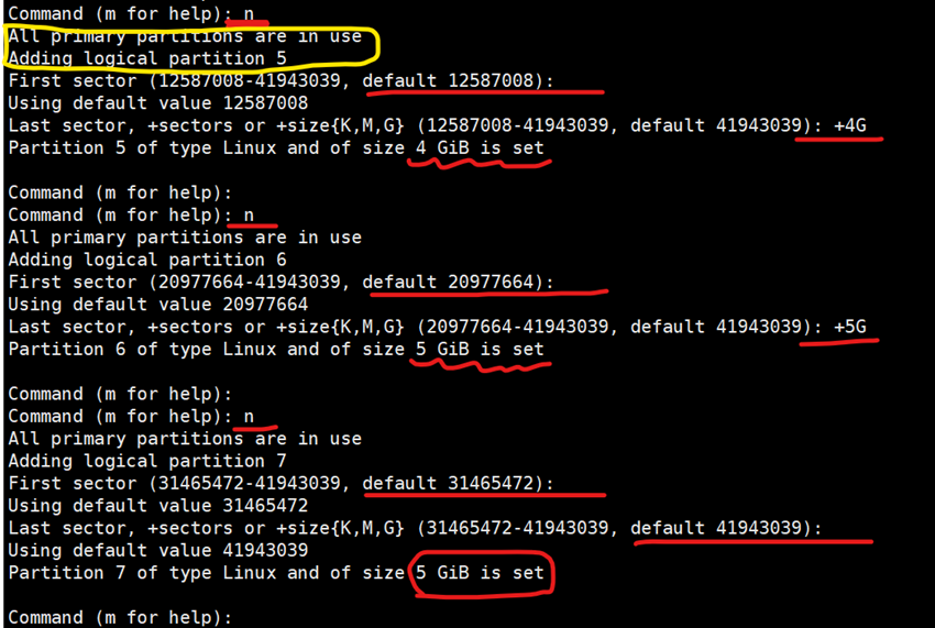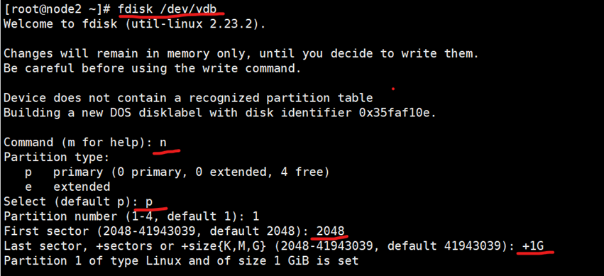 + 2GB + 3GB + 4GB + 5GB + 5GB (2)开始对vdb硬盘设备进行分区操作,创建第1个分区为主分区,分区大小为1GB。(n为新增分区,p为创建主分区)