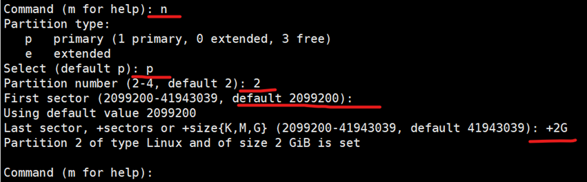 (3)创建第2个分区为主分区,分区大小为2GB。(n为新增分区,p为创建主分区)