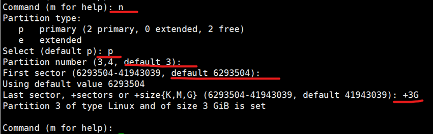 (4)创建第3个分区为主分区,分区大小为3GB。(n为新增分区,p为创建主分区)