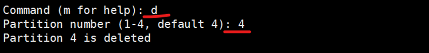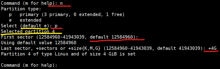 (5)我们先创建第4个分区为主分区,分区大小为4GB。(n为新增分区,p为创建主分区)