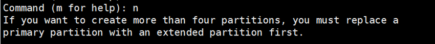 (6)接下来,我们尝试继续创建第5个分区,发现不能继续创建了,系统给出了如下图所示的提示,翻译为“如果要创建四个以上的分区,必须先用扩展分区替换主分区”,意思就是说已经创建了4个主分区了,所以不能在进行新分区的创建了,要是还想继续创建分区的话。就需要将现有的主分区至少去掉一个,然后重新创建一个“扩展分区”,然后在扩展分区上创建“逻辑分区”,这样才能继续创建四个以上的分区。(n为新增分区)