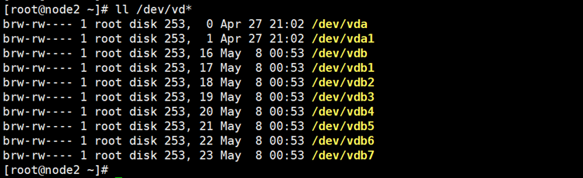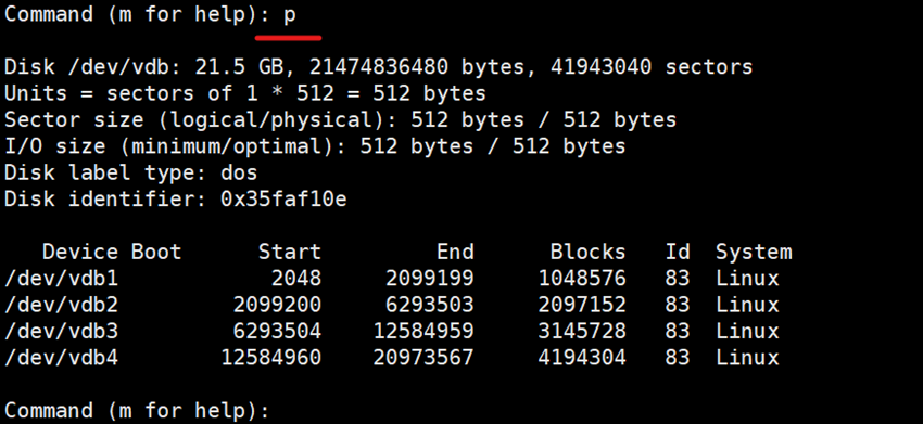(7)我们查看一下当前vdb硬盘设备的分区状态,显示已经分成了4个分区(均为主分区)。