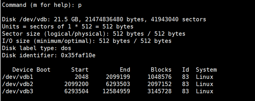 (9)再次查看vdb硬盘设备的分区状态,显示还有3个分区(均为主分区),说明分区vdb4删除成功。