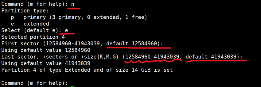 (10)继续对vdb硬盘设备进行分区操作,新建一个分区,这次选择新建为“扩展分区”(n为新增分区,e为创建扩展分区),分区大小为vdb剩余的所有磁盘空间(14GB)。