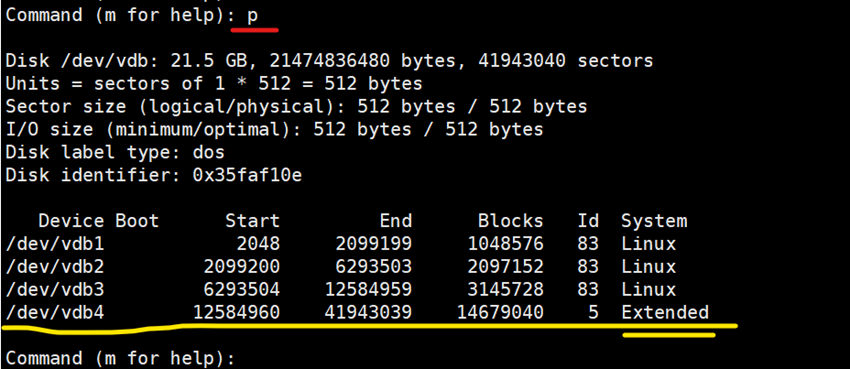 (11)查看vdb硬盘设备的分区状态,显示这时的vdb4分区为“扩展分区”。