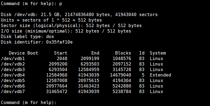 (13)再次查看vdb硬盘设备的分区状态,已经成功按照前面的规划分出了6个可用分区。(vdb4为扩展分区,只能用于存放逻辑分区的分区表信息,不可用于存放系统存储文件)
