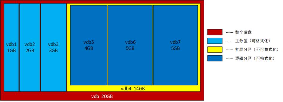 2. 进行磁盘分区与挂载操作 (1)磁盘设备vdb(20GB)的分区规划: 共分成6个分区,每个分区空间大小规划如下: 20GB = 1GB