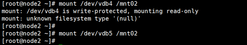 (23)尝试对扩展分区(vdb4)进行挂载,结果表示不能挂载扩展分区,但是逻辑分区(如vdb5)是可以正常挂载的。