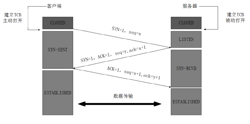 (1)准备工作 最开始的时候客户端和服务器都是处于CLOSED状态。主动打开连接的为客户端,被动打开连接的是服务器。 TCP服务器进程先创建传输控制块TCB,时刻准备接受客户进程的连接请求,此时服务器就进入了LISTEN(监听)状态。 (2)一次握手: TCP客户进程也是先创建传输控制块TCB,然后向服务器发出连接请求报文,这是报文首部中的同部位SYN=1,同时选择一个初始序列号seq=x。 此时,TCP客户端进程进入了 SYN-SENT(同步已发送状态)状态。TCP规定,SYN报文段(SYN=1的报文段)不能携带数据,但需要消耗掉一个序号。 (3)二次握手: TCP服务器收到请求报文后,如果同意连接,则发出确认报文。确认报文中应该ACK=1,SYN=1,确认号是ack=x+1,同时也要为自己初始化一个序列号seq=y,此时,TCP服务器进程进入了SYN-RCVD(同步收到)状态。这个报文也不能携带数据,但是同样要消耗一个序号。 ACK为1表示确认号有效,为0表示报文中不包含确认信息。 (4)三次握手: TCP客户进程收到确认后,还要向服务器给出确认。确认报文的ACK=1,ack=y+1,自己的序列号seq=x+1,此时,TCP连接建立,客户端进入ESTABLISHED(已建立连接)状态。TCP规定,ACK报文段可以携带数据,但是如果不携带数据则不消耗序号。 当服务器收到客户端的确认后也进入established状态,此后双方就可以开始通信了。 注:tcp建立连接需要三次握手,SYN是发送标志位,ACK是确认标志位 【为什么TCP客户端最后还要发送一次确认呢?】 主要防止已经失效的连接请求报文突然又传送到了服务器,从而产生错误。 如果使用的是两次握手建立连接,假设有这样一种场景,客户端发送了第一个请求连接并且没有丢失,只是因为在网络结点中滞留的时间太长了,由于TCP的客户端迟迟没有收到确认报文,以为服务器没有收到,此时重新向服务器发送这条报文,此后客户端和服务器经过两次握手完成连接,传输数据,然后关闭连接。此时此前滞留的那一次请求连接,网络通畅了到达了服务器,这个报文本该是失效的,但是,两次握手的机制将会让客户端和服务器再次建立连接,这将导致不必要的错误和资源的浪费。 如果采用的是三次握手,就算是那一次失效的报文传送过来了,服务端接受到了那条失效报文并且回复了确认报文,但是客户端不会再次发出确认。由于服务器收不到确认,就知道客户端并没有请求连接。 【为什么要3次握手?】 换个易于理解的视角来看为什么要3次握手。 客户端和服务端通信前要进行连接,3次握手的作用就是双方都能明确自己和对方的收、发能力是正常的。 第一次握手:客户端发送网络包,服务端收到了。这样服务端就能得出结论:客户端的发送能力、服务端的接收能力是正常的。 第二次握手:服务端发包,客户端收到了。这样客户端就能得出结论:服务端的接收、发送能力,客户端的接收、发送能力是正常的。从客户端的视角来看,我接到了服务端发送过来的响应数据包,说明服务端接收到了我在第一次握手时发送的网络包,并且成功发送了响应数据包,这就说明,服务端的接收、发送能力正常。而另一方面,我收到了服务端的响应数据包,说明我第一次发送的网络包成功到达服务端,这样,我自己的发送和接收能力也是正常的。 第三次握手:客户端发包,服务端收到了。这样服务端就能得出结论:客户端的接收、发送能力,服务端的发送、接收能力是正常的。