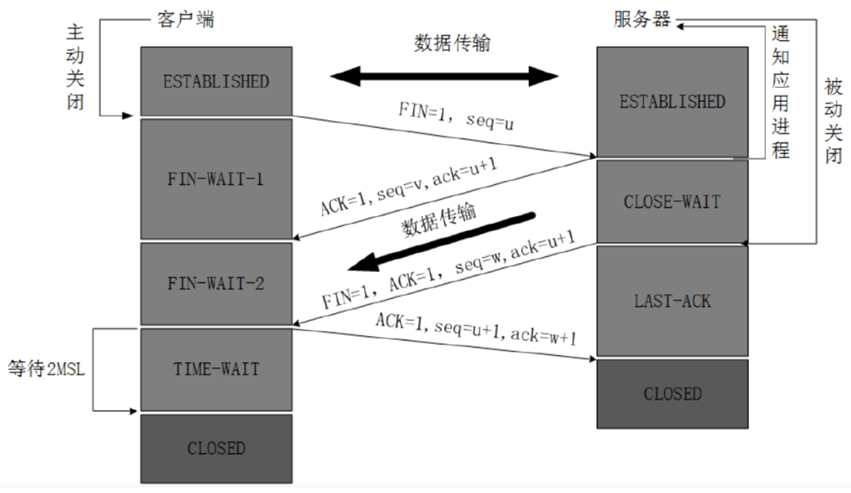 第一、二次握手后,服务端并不知道客户端的接收能力以及自己的发送能力是否正常。而在第三次握手时,服务端收到了客户端对第二次握手作的回应。从服务端的角度,我在第二次握手时的响应数据发送出去了,客户端接收到了。所以,我的发送能力是正常的。而客户端的接收能力也是正常的。 经历了上面的三次握手过程,客户端和服务端都确认了自己的接收、发送能力是正常的。之后就可以正常通信了。 2. TCP连接的释放(四次挥手) 数据传输完毕后,双方都可释放连接。最开始的时候,客户端和服务器都是处于established(表示连接已经建立)状态,然后客户端主动关闭,服务器被动关闭。