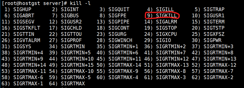 (2)通过“kill -l”命令查看杀进程的操作信号,可以看出是9: