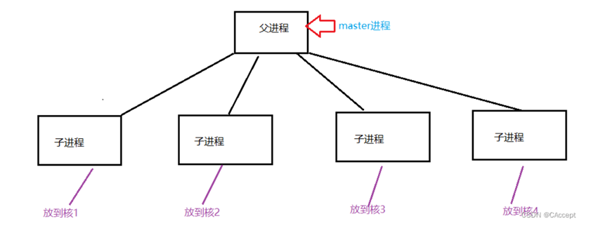 1. 子进程、父进程 由一个master进程进行管理它所生成的几个子进程,然后将几个子进程平均分到各个核(core)中运行 优点1:充分利用多核系统的并发处理能力 优点2:负载均衡 优点3:职责更清晰,工作进程工作,管理进程做管理
