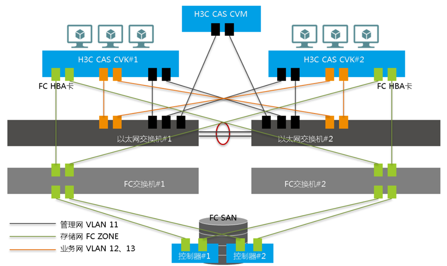 图3-1 FC SAN 存储典型组网图 ① CVM主机(即管理主机)至少需要2个网卡,分别连接两台以太网交换机,2个网卡做聚合,此时CVM主机不承载虚拟机业务。 ② CVK主机(即业务主机)至少需要4个网卡,分别用于管理网(2个网卡)、和业务网络(2个网卡)。管理网和业务网络的2个网卡分别连接到两台以太网交换机,并且管理网和业务网络的2个网卡分别做网卡聚合。至少需要1个双端口的FC HBA卡,分别连接两台FC交换机,并且配置多路径。 ③ FC SAN 共享存储至少需要1个双端口 FC HBA 卡,分别连接两台 FC 交换机,并且配置多路径。 ④ 管理网和业务网络通过 VLAN 隔离。 ⑤ CVK 服务器到 FC 交换机的链路以及 FC 交换机到存储控制器的链路推荐使用交叉方式连接,提高FC 路径的冗余性。在启用多路径的情况下,任何一条路径 down 掉后,都不会影响到服务器到存储的访问,保证业务的稳定性。