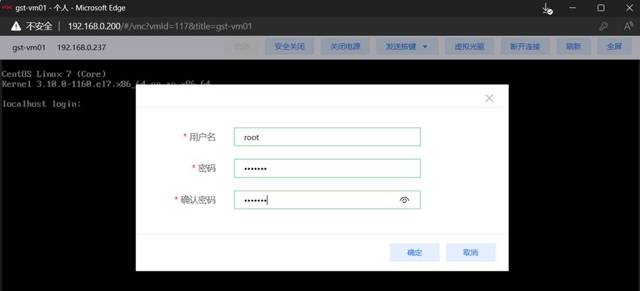 3、打开密码重置界面后,输入用户名root和新的密码,然后点击确定即可完成对虚拟机root的密码的修改。