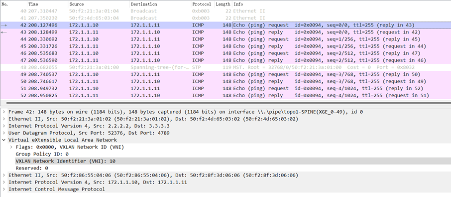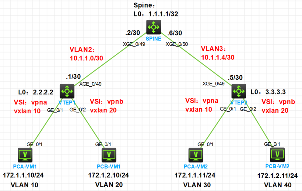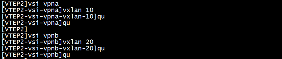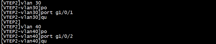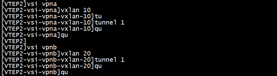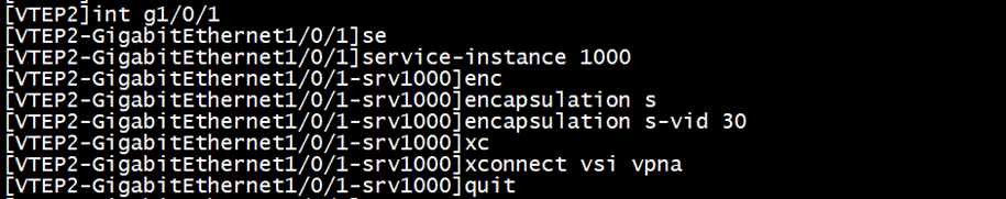 2. 配置VTEP2 # 在接口GigabitEthernet1/0/1上创建以太网服务实例1000,该实例用来匹配VLAN 30(PCA-VM2)的数据帧,将该服务实例与 vpna(VXLAN 10)关联。