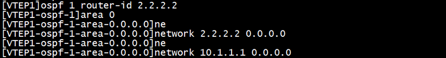 2. 在IP核心网络上配置路由协议 1. 在VTEP1上配置 OSPF 发布接口所在网段的路由。