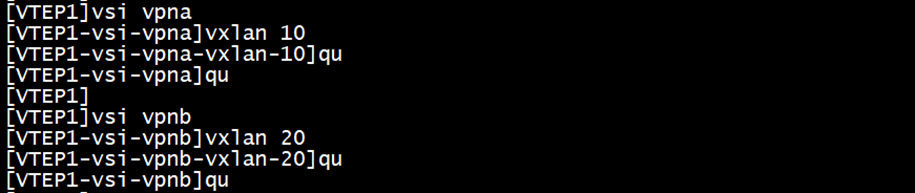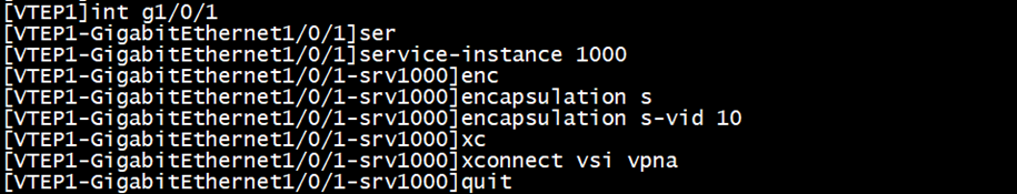 6. 配置以太网服务实例匹配用户报文,并将其与VSI关联 1. 配置VTEP1 # 在接口GigabitEthernet1/0/1上创建以太网服务实例1000,该实例用来匹配VLAN 10(PCA-VM1)的数据帧,将该服务实例与 vpna(VXLAN 10)关联。