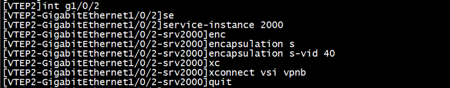 # 在接口GigabitEthernet1/0/2上创建以太网服务实例2000,该实例用来匹配VLAN 40(PCB-VM2)的数据帧,将该服务实例与 vpna(VXLAN 20)关联。