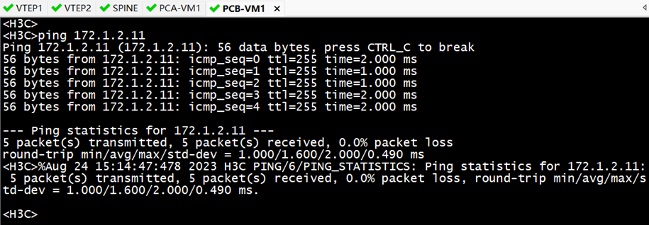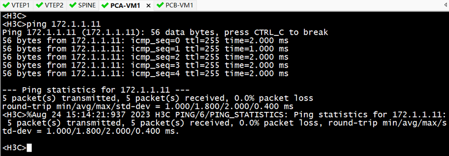 三、测试验证 1. PCA-VM1 与 PCA-VM2 互 ping。