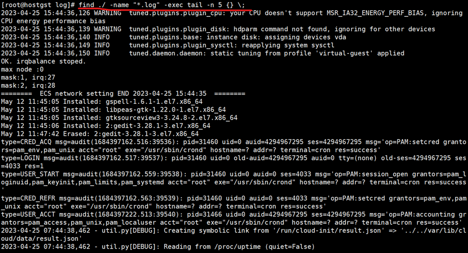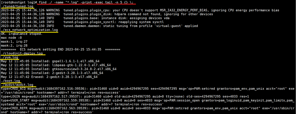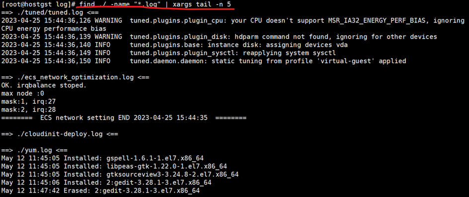 。 方法二:通过find 命令的 -exec 选项来显示多个日志文件的最后五行: [root@hostgst log]#